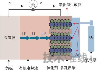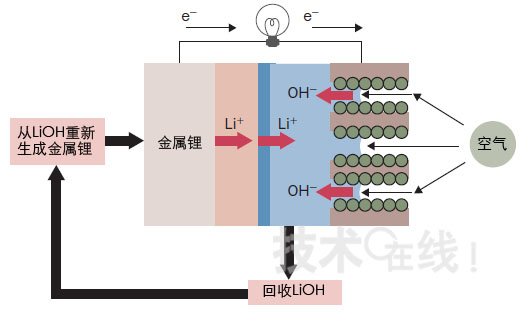 鋰—空氣電池的概念很早就提出來了(圖7)。由于在正極上使用空氣中的氧作為活性物質,因此理論上正極的容量密度是無限的,可加大容量。另外,如果負極使用金屬鋰,理論容量會比鋰離子充電電池提高一位數。