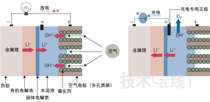 在該電池中,由放電反應生成的并非是固體的Li2O,而是容易溶解在水性電解液中的LiOH(氫氧化鋰)。因此,氧化鋰在空氣電極堆積后,不會導致工作停止。另外,水及氮等也不會穿過固體電解質的隔壁,因此不存在與負極的鋰金屬發生反應的危險。而且,在充電時,如果配置充電專用的正極,還可防止充導電致空氣電極的腐蝕和老化。