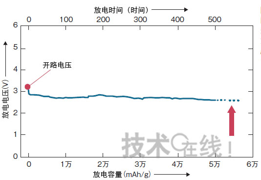 圖9:新結構鋰-空氣電池的長時間連續放電曲線放電容量約為5萬mAh/g,是比原來的鋰-空氣電池高一位數。