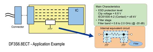 東芝美國電子元器件公司(TAEC)最新推出具有靜電放電(ESD)保護和電磁干擾(EMI)濾波的二極管。東芝DF3S6.8ECT保護二極管提供數字和移動器件如:手機,PDA,筆記本電腦,數碼相機,以及具有EMI和ESD保護的GPS設備,這些靜電放電能源通過用I/O端口和通過連接器進入到系統電路板上。