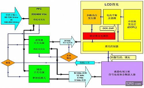 傳統液晶電視電源主要包括交流-直流(AC-DC)轉換、直流-直流(DC-DC)轉換及高壓逆變器這幾個部分。AC-DC和DC-DC位于同一塊電路板,而逆變器為獨立電路板,通常與液晶面板一起提供。其中,AC-DC電源部分,市電110Vac/220Vac電壓經過整流、功率因數校正(PFC)和濾波,轉換為200V/400V的直流高壓。由于傳統逆變器的輸入電壓要求是24V,所以PFC的輸出電壓200V/400V電壓須經過降壓轉換,產生多路的輸出電壓,其中一路24V電壓提供給逆變器,即再經過直流-交流(DC-AC)轉換為超過1,000V甚至達2,000V的高壓,去驅動液晶面板的CCFL背光燈。這種標準24V逆變器液晶電視開關電源的功能框圖如圖1所示。