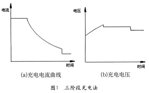 三階段充電法是兩階段等流充電法和恒定等壓充電法相結合的方式。充電開始和結束時采用恒定電流,中間階段為恒定電壓充電。蓄電池在充電初期用較大的電流,經過一段時間改為恒定電壓充電,當電流衰減到預定值時,由第二階段轉到第三階段。采用三階段充電法的優點是:避免了恒定電壓充電法開始充電電流過大,而后期電流又過小的情況,比二階段等流充電在中間階段更接近充電電流接受率曲線。這種充電法減少了充電出氣量,充電又徹底,延長了蓄電池使用壽命。三階段充電法充電電流和充電電壓變化曲線如圖1所示。[page]