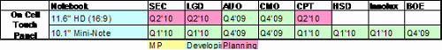 隨著Windows 7推出與對未來市場影響力,2010年多數(shù)面板廠商針對Notebook PC市場積極開發(fā)具觸控功能11.6寸寬螢幕面板,同時每一家生產(chǎn)迷你筆電面板廠商也都開發(fā)具有觸控功能面板。從下表一可以清楚了解每一廠商開發(fā)具觸控功能Notebook PC或迷你筆電面板時間表。