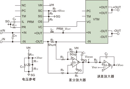 上述電路由電壓參考、分流電阻、差分放大器和誤差放大器組成。低端檢測電路是在PRM輸出端用配置為差分放大器的一個運放實現(xiàn)的。分流電阻(R1)上的電壓經(jīng)檢測并被放大電阻R2到R5確定的增益倍數(shù)。參考電壓使用精確可調(diào)的分流參考產(chǎn)生,并連接到誤差放大器的同相端子。這是誤差放大器用以與差分放大器輸出(VSENSE)比較的電壓。誤差放大器的輸出(VEAO)經(jīng)過電阻R7和R8連接到SC,從而實現(xiàn)PRM輸出設(shè)置點的調(diào)整。誤差放大器將調(diào)整PRM輸出電壓,直到VSENSE等于參考電壓VREF。這將迫使VTM輸入電流以及VTM輸出電流成為由VREF確定的常數(shù)。