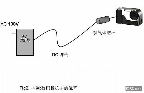 在許多情況下,帶有AC適配器的便攜式設備所產生的共模噪聲,一般是通過在線上加一個鐵氧體磁環來抑制(圖2)。盡管這是一個有效的噪聲抑制方式,但是它也存在許多不足,比如,加上磁環之后導線會變得沉重和龐大,且外觀不雅。如果改用一個小尺寸的片式共模扼流圈用于此類導線的共模噪聲的抑制,是個不錯的選擇,值得重點推薦。