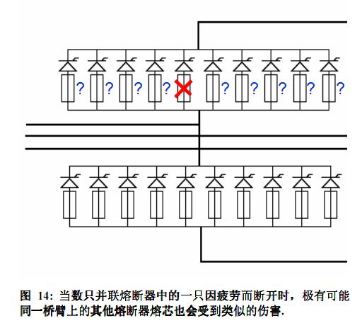 在多個aR熔斷器并聯時,如其中一個因過負荷而斷開,該熔斷器和與之相連的半導體兩端的壓降都很小,使得半導體可能不能充分導通,從而不能熔斷指示器的觸發線。這種情況下熔斷器的指示器將不能正確顯示熔斷器的狀態,在同一橋臂與之并聯的其他熔斷器實際上將承受更高程度的過負荷,它們熔芯的損壞也將由此加速。現代整流器系統能夠監視到這種超限溫升,這表明著橋臂中一定有異常發生。不幸的是,這時危害極有可能已經產生,必須對相應的熔斷器進行分析診斷。