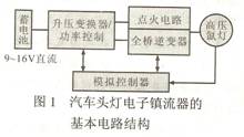 為了滿足燈在啟動與穩態時的不同要求,目前,一般采用的汽車頭燈用電子鎮流器的基本電路結構包含圖1所示的4部分功能。