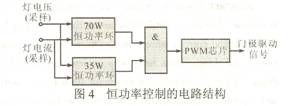 由圖3可知,全橋逆變電路的總體負載只有燈消耗有功功率,因此燈消耗的功率可近似看作是逆變器的輸入功率。所以通過不斷采樣燈回路上的輸出電壓Uo和輸出電流Io,采用拋物線近似的恒功率控制方法,用模擬電路來實現可使控制精度達到±5%左右的恒功率控制。但是,汽車頭燈比較特殊,為了要滿足其在4s內達到額定光輸出的80%這一特殊要求,一開始提供70W的瞬態功率給燈,而汽車頭燈的額定功率為35W。所以,在設計時需要兩個恒功率控制環,兩者的切換通過一個門電路來實現,圖4示出恒功率控制的電路結構