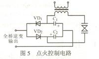 點火方式采用脈沖式點火,電路采用倍壓整流電路。圖5示出點火控制電路。全橋逆變器輸出的正向電壓先把VD2導通,給電容C2充電;輸出的負電壓把VD1導通,給C1充電。當每個電容都充電到400V時,可使800V的氣體放電管觸發導通,開始放電。這樣,當變壓器初級產生800V脈沖時,次級就會產生上萬伏的高壓脈沖,從而將高強度的氣體放電管雪崩擊穿。