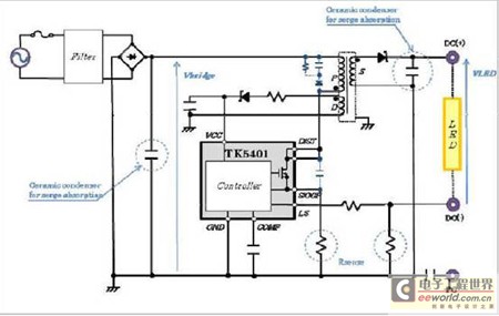 創(chuàng)意電子新近推出的TK5401就是這樣一款LED驅(qū)動(dòng)電源IC,它具有不需要DC電源特性中所必須的電解電容的特性,使得LED壽命高達(dá)4萬小時(shí)以上。據(jù)介紹,TK5401封裝內(nèi)置了高電壓功率MOS管及控制電路,因去除電解電容實(shí)現(xiàn)了小型化、低成本,并且實(shí)現(xiàn)了LED燈的長壽命和高效能。