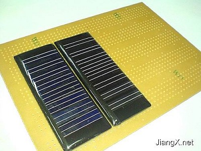 首先剪一小段金屬絲焊接在太陽能電池板的兩個電極上作為引腳(圖3),以便于連接和固定在電路板上。兩塊太陽能電池板是正極對正極,負極對負極(上面有標識)并聯起來使用的,這樣可以有效地增強太陽能電池板提供電流的能力。安裝好太陽能電池板后如圖4所示。