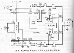 圖5所示MAX4410典型的立體聲耳機放大器應用電路。設置輸入電容Cin等于10μF時能夠將電容器電壓系數的影響限制到亞音頻頻率,該電路省略了大容量的輸出耦合電容器。
