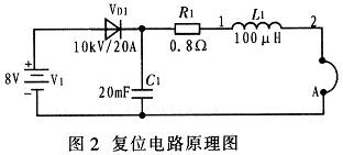 圖2中,V1為低壓直流電源,R1為限流電阻。由V1通過R1提供一個直流電流給單匝復位線圈A。在高壓脈沖變壓器工作時,單匝線圈A上會感應較高的電壓,利用電感L1,電容C1和高壓硅堆VD1對低壓直流電源V1進行保護。