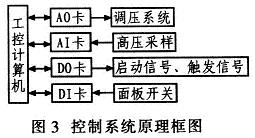 控制系統原理框圖如圖3所示。通過計算機控制AO卡(模擬量輸出)輸出0~10V的模擬量,用來控制調壓系統中的可控硅調壓器的輸出。儲能電容器上的電壓經過高壓采樣和AI卡(模擬量輸入),由計算機采集。計算機控制DO卡(數字量輸出)輸出控制信號控制各類啟動開關和IGBT驅動板輸出觸發信號。各類手動面板的開關信號經過DI卡(數字量輸入),由計算機采集。