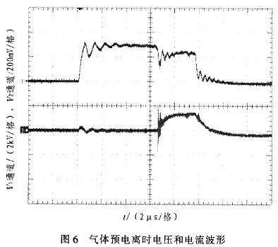圖4中,縱坐標為電壓幅度值(2通道2kV/格,4通道200mV/格)。通道2為電壓波形,電壓約為5kV,脈沖寬度為10μs,上升沿小于lμs。通道4為電流波形,電流值約85A(波形圖中比例為l:500)。圖5中,脈沖周期為5ms,重復頻率為200Hz。圖6中,縱坐標為電壓幅度值(1通道5kV/格,2通道2V/格)。l通道為放電電壓波形,2通道為放電電流波形。從波形圖中可以看出,脈沖當電壓加在氣體上時,大約經過幾微秒時間后,氣體發生電離。此時由于分壓原因,電壓幅值略有下降,電流波形開始出現。在脈沖電壓加載期間,氣體維持了電離狀態。