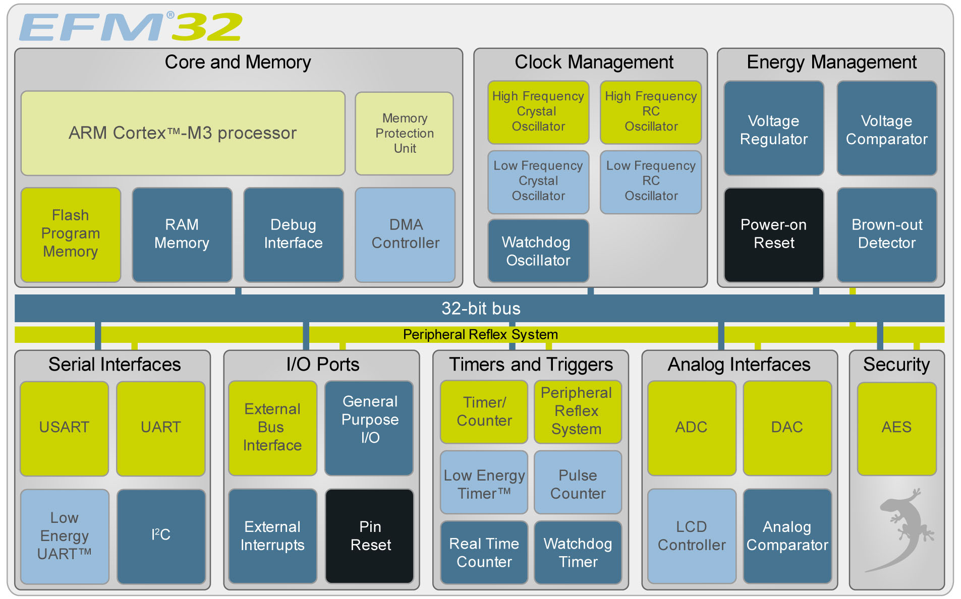 Cortex - M3內核能夠執行軟件中的眾多任務,其低功耗運行決定了某些功能仍可以處理更多的硬件電源效率。 為EFM32開發的外圍設備用于自主運作,無需內核的干預。使用一個復雜的互連矩陣外圍設備反射系統,EFM32的外圍設備能夠執行不喚醒睡眠模式下內核的相對復雜的功能。 在典型應用中,例如它可能經常使用ADC來進行測量。EFM32具有低水平驅動程序庫的特點,支持Cortex - M3配置自主操作的外圍設備。這樣,一旦配置好了,它們就可以執行許多任務,無需喚醒內核。