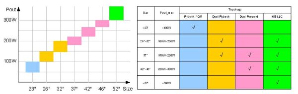 圖4:傳統式LCDTV主電源功率范圍及架構選擇。