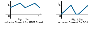 升壓電路可操作于二種模式,連續(xù)導(dǎo)通模式(ContinuousConductionMode;CCM)或不連續(xù)導(dǎo)通模式(DiscontinuousConductionMode;DCM),這二種模式是由電感電流的波形決定的。圖2a為CCM升壓電路的電感電流波形,圖2bDCM升壓電路的電感電流波形。
