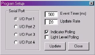 端口選擇、指示器和燈發(fā)光電平的輪詢、事件定時器、更新率選擇等。如圖3表示程序設置工作界面所示。