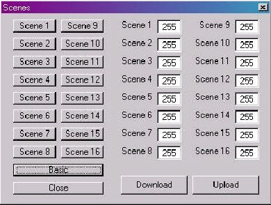 按下“scenexx”按鈕可工作在預先定義的背景級,背景級的選擇支持所有工作模式,利用主界面的“廣播”尋址并按下“scene3”按鈕將使所有電子鎮(zhèn)流器預先定義的“scene3”背景級(如果預先有定義)。