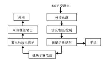 從手機(jī)鋰離子二次電池的恒流/恒壓充電控制出發(fā),用220V交流電通過(guò)配置的內(nèi)置儲(chǔ)能鋰電池對(duì)手機(jī)鋰離子電池充電。電路的具體工作流程如圖1所示。