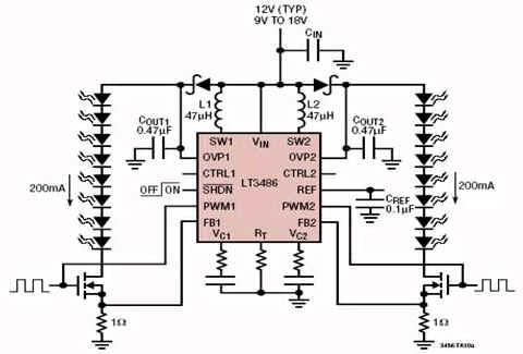 兩個LED串的調光也可通過各自的CTRL引腳來單獨地控制。通過把一個PWM信號饋送至各自的PWM引腳,一個內部PWM調光系統可使調光范圍擴展至高達1000:1。LT3486的工作頻率可由一個外部電阻器設置在200kHz至2MHz的范圍內。一個200mV的低反饋電壓(2%準確度)最大限度地減少了電流設定電阻器中的功率損耗,旨在提升效率。另外的特點包括LED斷接時的輸出電壓限制。LT3486提供了一款占板面積非常緊湊的解決方案,并可采用節省空間的16引腳DFN(5mmx3mmx0.75mm)封裝或16引腳耐熱增強型TSSOP封裝。
