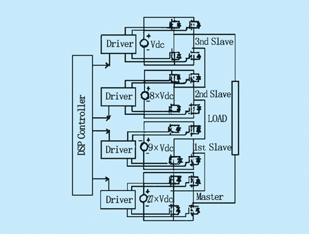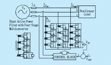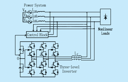 一直處于研究階段的多級逆變器,最近被用于APF拓?fù)渲校瑘D11為配有三級逆變器的并聯(lián)APF,今天在大多數(shù)的逆變器應(yīng)用領(lǐng)域,三級逆變器已愈益普及,例如功率因數(shù)補(bǔ)償器。多級變換器的優(yōu)點是能降低APF產(chǎn)生的諧波含量。因與普通變頻器比較,能輸出更多(>2級)的電壓,這一特點有利于減少濾波器本身產(chǎn)生的諧波。另一優(yōu)點是能減少半導(dǎo)體電壓或電流的定額,以及減少所需的開關(guān)頻率。