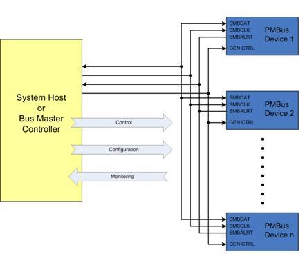 系統(tǒng)主機(jī)可以是安裝于印刷電路板(PCB)上作為電源管理總線裝置的實(shí)體裝置,如現(xiàn)場(chǎng)可編程門(mén)陣列(FPGA),微處理器或通用的微控制器,也可以是處于系統(tǒng)外部的控制實(shí)體,如自動(dòng)檢驗(yàn)設(shè)備,甚至可以是臺(tái)式電腦中的控制軟件。能夠用于系統(tǒng)管理總線通信的任何物體均可用作電源管理總線系統(tǒng)的界面。