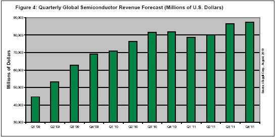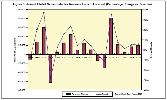 iSuppli公司預(yù)測,半導(dǎo)體產(chǎn)業(yè)將連續(xù)增長七個季度,然后在2011年第一季度出現(xiàn)季節(jié)性下降。 這將是該產(chǎn)業(yè)在1991至1995年期間連續(xù)增長19個季度之后,連續(xù)增長時間最長的一次。