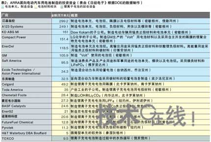 在奧巴馬政權(quán)的經(jīng)濟(jì)刺激政策“ARRA”的7872億美元中,美國能源部(DOE)將其中的14億9190萬美元用于電動車輛用充電電池的生產(chǎn)(表2)。利用該ARRA投資的條件是,接受投資的企業(yè)需要自行準(zhǔn)備與投資額大致相同的資金,因此共計有約30億美元的資金用于電池生產(chǎn)。