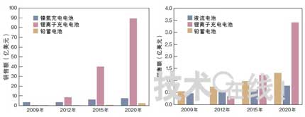 北美的大容量充電電池市場今后有望大幅增長。據(jù)估算,2020年面向電動汽車及電車等交通用途的市場規(guī)模將擴(kuò)大至99億美元左右(下圖)。