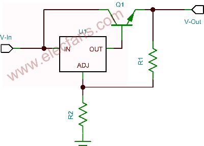 計算過程中輸入電流的使用,使得穩壓器靜態或接地電流均得到考慮。在要求負載電流大于穩壓器承受能力的情況下,可以添加一個外部晶體管,如圖4所示。這種做法僅適用于可調輸出穩壓器。