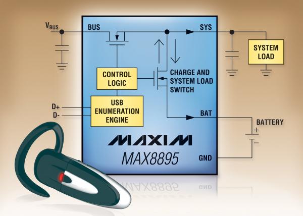 Maxim推出線性電池充電器MAX8895,器件適用于符合USB電池充電規范(1.1版本)的Bluetooth®耳機和便攜設備。MAX8895獨特地集成了自動適配器檢測功能,可分辨USB設備、USB充電器和專用充電器。器件還具有USB枚舉功能,可自動與USB主機進行交互,無需處理器干預即可優化充電電流。該功能無需使用單獨的微控制器和系統軟件,因而可提供業內僅有的單機運行充電方案。