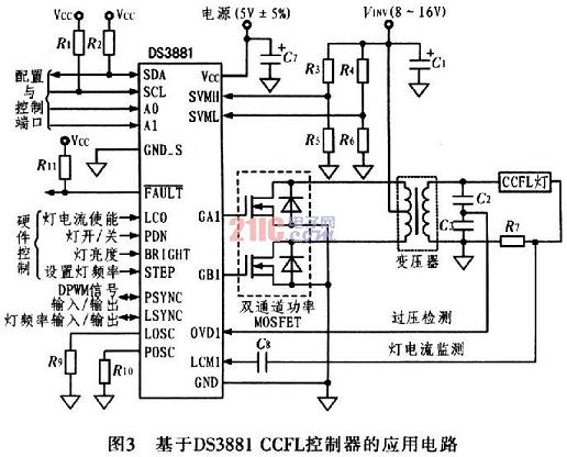 由于基本的CCFL電路中包含有外部晶體管、變壓器和燈管,CCFL架構(gòu)存在EMI輻射源。圖3給出利用DS388lCCFL控制器構(gòu)建的CCFL燈管電源電路,該設(shè)計(jì)優(yōu)化于汽車應(yīng)用環(huán)境。DS388l利用擴(kuò)展頻譜和頻率偏移技術(shù)大大降低了EMI輻射,并把噪聲頻譜搬移到系統(tǒng)不敏感的頻段,從而克服了EMI輻射。