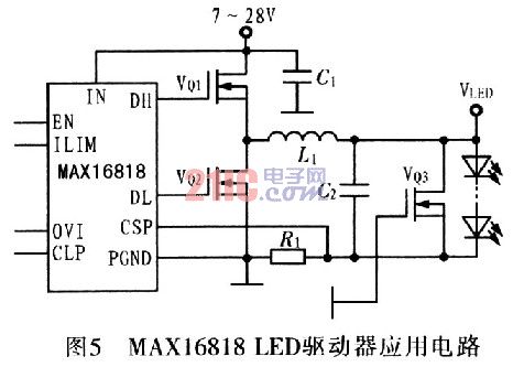 需要較高照明功率的場(chǎng)合,如泛光燈或霧燈,必須使用超高亮度LED(HBLED)。HBLED需要較高的驅(qū)動(dòng)電流,前面討論的產(chǎn)品無(wú)法提供低成本設(shè)計(jì),需要過(guò)多的驅(qū)動(dòng)器產(chǎn)生所需的電流。最好采用能驅(qū)動(dòng)大電流功率管的控制器,大電流功率管可以為HBLED提供高達(dá)30A的電流,MAXl6818可以滿足這種設(shè)計(jì)要求,如圖5所示。