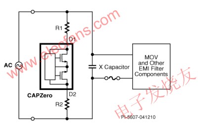 要想實現(xiàn)待機電流接近零的目標,就必須找到能消除R1和R2連續(xù)電流消耗的解決方案。PowerIntegrations新推出的CAPZeroIC可以輕松實現(xiàn)這一點。圖2所示為CAPZero在典型應用中的使用情況。