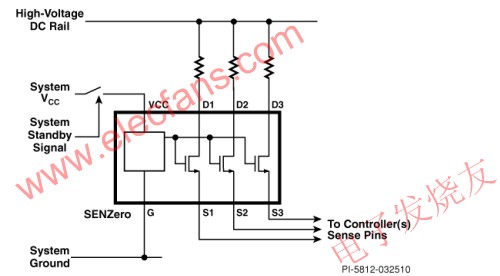 在該應用中,內部柵極驅動和保護電路在檢測到VCC引腳電壓后,向內部的650VMOSFET提供柵極驅動信號。這種簡單配置將系統(tǒng)VCC母線用作SENZero的輸入端,可輕松集成到現(xiàn)有系統(tǒng)中。VCC母線在電源進入待機模式后關斷,從而關斷SENZero器件的MOSFET,使每個通路中的功耗大幅降低到500μW以下。