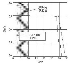 如圖4所示為使用MOSFET(V3)的開關(guān)電路。VDZ4及VDZ5分別采用28V及15V穩(wěn)壓管。當(dāng)輸入電壓超過28V時VDZ4被反向擊穿,使V3導(dǎo)通,將電源開啟。當(dāng)輸入電壓超過43V時VDZ5也被反向擊穿,能限制V3的柵-源電壓,起到保護(hù)作用。R15能防止V3被誤導(dǎo)通。該以太網(wǎng)電源模塊的識別信號阻抗與輸入電壓的關(guān)系曲線如圖5所示,識別電壓范圍是2.5~10V。
