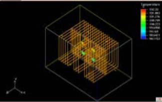 散熱面積A=0.66 2 m ,求得Δt= Q/( h ηA)=51.2566 °C。肋片溫度t 等于環境溫度與溫升Δt之和,即t=50+51.2566=101.2566°C;這表明,所設計的散熱器在自然冷卻的散熱方式下,略高于器件的溫升要求,下面我們再借助ICEPAK對散熱器的參數進行優化,并采用強迫風冷,以期得到更低的肋片溫度。