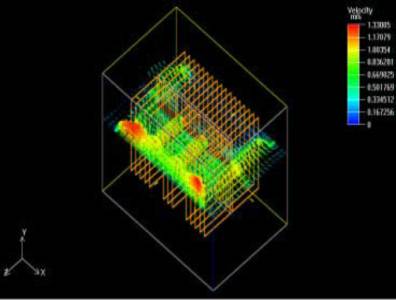 盡管散熱器的參數優化對溫升控制略有改善,但仍不能滿足功率管的可靠性要求,因此,我們考慮強迫風冷的散熱方式。在上述計算模型的基礎上,我們在垂直方向設定流體的流速為1.5m/s , 即在散熱器底部送風,其他參數不變。我們注意到,此時系統給出的流態為紊流。在初始條件中作相應的調整后,最終求得的器件表面最高溫度約為89°C。散熱器底板截面溫度圖及橫向風速云圖分別見圖2、3。