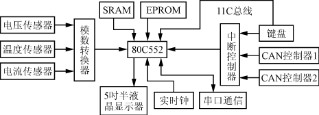 系統的主要功能包括數據采集、電量估計及顯示診斷等。由于80C552具有8路10位A/D轉換的功能,因此,采集模塊先采用線性光耦法測量單電池的電壓,通過其4個A/D口將模擬量轉換為數字量存入存儲器,溫度測量采用單總線技術,使用Dallas數字芯片來測量溫度,該芯片具有12位的精度等級,能非常準確地測量到系統的溫度。總電壓、電流信號通過特殊的傳感器將其信號轉換為0~10V的信號,通過14位的A/D轉換器件轉換為數字量存入系統。