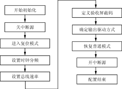 SJA1000在上電硬件復位之后,必須對其進行軟件初始化之后才可以進行數據通訊,初始化過程主要包括對其復位模式下配置時鐘分頻寄存器CDR、總線定時寄存器BTR0和BTR1、驗收代碼寄存器ACR、驗收屏蔽寄存器AMR及輸出控制寄存器OCR等,實現對總線的速率、驗收屏蔽碼、輸出引腳驅動方式、總線模式及時鐘分頻進行定義。具體的流程如圖5所示。下面為SJA1000發送和接收數據的流程,基本過程為主控制器將數據保存到SJA1000發送緩沖器,然后對命令寄存器的發送請求TR標志位進行置位開始發送;接收過程為SJA1000將從總線上接收到的數據存入接收緩沖器,通過其中斷標志位通知主控制器來處理接收到的信息,接收完畢之后清空緩沖器,等待下次接收,具體的流程如圖6和圖7所示。