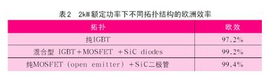圖16所示拓撲結構允許純無功負載,能夠提高對電網的無功補償,也能滿足雙向功率流動,例如實現高效電池充電。如果應用sic肖特基二極管,這種電路拓撲將可以達到更高的效率等級。表2是2kw額定功率下不同拓撲結構的歐洲效率