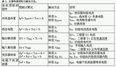 開關電源的損耗包含導通損耗、開關損耗以及外圍控制電路損耗,電路不同部分的損耗成因各不相同,因此抑制損耗的方法也有不同。需要用數學方程式量化這些損耗,進而整理出降低各部分損耗的方法,才能得出具體有效降低整體損耗的方案。為了討論方便,本文以常用的回掃轉換器為例,將各部分損耗以數學方程式表示,并列出解決方法。表2、表3及表4分別為導通損耗、切換損耗以及外圍控制電路損耗的原因分析與解決對策。