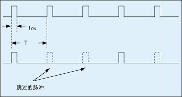 圖1為脈沖跳躍技術示意圖。當負載降低時,驅動功率開關的開關脈沖將被遮蔽(即跳過),部分脈沖被省略也即等效于降低了開關頻率,可降低高頻開關帶來的損耗,然而這種降頻方式會造成輸出電壓突降或突升(圖2)。