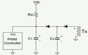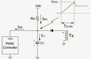 起動電路損耗在電源轉換器空載待機損耗中占很高的比例,此處我們介紹一種起動速度快且損耗低的起動電路。圖6(a)為傳統起動電路,其中VSTA是脈寬調制控制器起始臨界電壓,TD_ON是啟動延遲時間,TD_ON=(C1×VSTA)/IC1。使用較大輸入電阻(Rin)可以有效降低電阻損耗,但啟動延遲時間會延長。因此建議采用圖6(b)電路,其中C1電容較小,這樣在用大輸入電阻時能夠降低起動電路的損耗,同時仍然擁有較快起動速度。較大的C2電容可提供穩定的電壓給控制器使用,不會增加起動延遲時間。