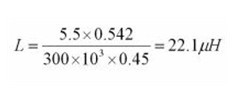 對于升壓型開關電源的電感值計算,除了占空比與電感電壓的關系式有所改變外,其它過程跟降壓型開關電源的計算方式一樣。以圖3為例進行計算,假設開關頻率為 300kHz、輸入電壓范圍5V±10%、輸出電流為500mA、效率為80%,則最大紋波電流為450mA,對應的占空比為:D=1-Vi/Vo=1-5.5/12=0.542 (7)