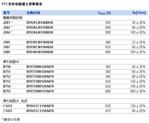 普通電阻在電容充電時常用來限制電流。不過,這常有技術(shù)風(fēng)險。舉例來說,當(dāng)短接電容器時,如果電容器短路或者繼電器失靈,電阻器將持續(xù)暴露在大功率電平下。這可能導(dǎo)致電阻器或者整個系統(tǒng)遭到破壞。愛普科斯采用基于PTC陶瓷的新式J20X系列充電電阻器,現(xiàn)已研發(fā)出一種專業(yè)解決方案:在自我防護(hù)的同時,還實(shí)現(xiàn)了相對緊湊的尺寸。如下表所示,J20X系列包括J201、J202和J204產(chǎn)品。
