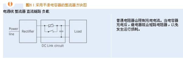 當(dāng)電容器充電時,通常需要串聯(lián)一個電阻器來限制充電電流,以免產(chǎn)生超過允許范圍的強(qiáng)電流峰值。一般是采用固定式普通電阻或負(fù)溫度系數(shù)(NTC)電阻實(shí)現(xiàn)這一功能。在大多數(shù)情況下,會在充電之后使用一個由時間或電壓控制的繼電器來短接限流元件。充電電流的制約對整流器和轉(zhuǎn)換器系統(tǒng)來說非常重要,因?yàn)楫a(chǎn)生的沖擊電流峰值如果未得到限制,可能會觸發(fā)熔絲或使整流器遭受超過允許范圍的強(qiáng)電流。圖1所示為傳統(tǒng)整流器或轉(zhuǎn)換器系統(tǒng)的方塊圖。