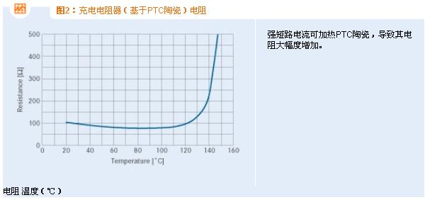 為處理典型故障,比如電容器短路或短路開關(guān)失靈,建議使用J20X系列自我防護(hù)式充電電阻器。在無故障充電中,這些元件的作用就像固定式普通電阻器,可制約充電電流的峰值。當(dāng)發(fā)生故障時,PTC陶瓷的溫度和內(nèi)阻將隨加大的歐姆損耗一同增加(見圖2),并將電流限定在安全級別。
